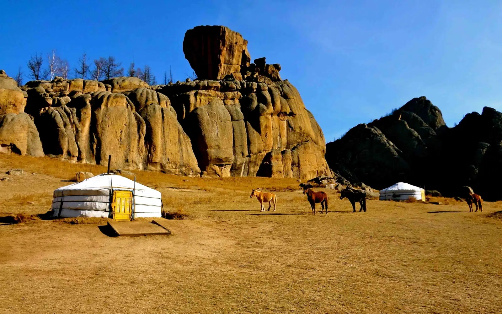 Votre aventure se poursuit vers les paysages saisissants du parc de Khögnö Khan, surnommé le « mini-Gobi ». Ici, se mêlent steppes semi-désertiques, taïga, formations rocheuses spectaculaires, et une fracture de sable longue de 80 km. Une mosaïque de paysages uniques.